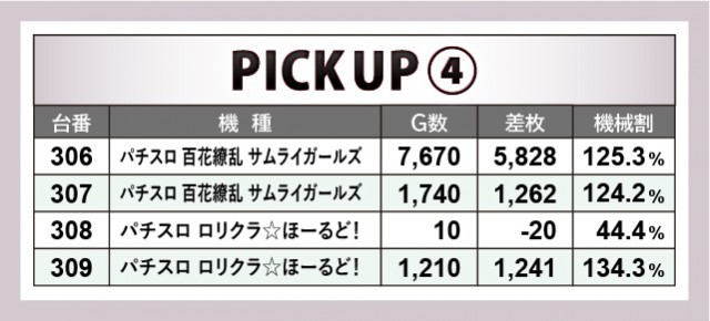 増台された『パチスロ北斗の拳 宿命』、そして少数設置台からは『パチスロ 百花繚乱 サムライガールズ』『パチスロ ロリクラ☆ほーるど!』の2機種が目立っていた。全体的に回転数不足が否めないため、ファンがもっと遊技することによって、より大きな記録が生まれた可能性があっただろう。『パチスロ 百花繚乱 サムライガールズ』306番台の結果が証明しているように、凄まじいポテンシャルが秘められていたのは明らかだ…!
