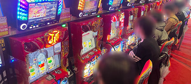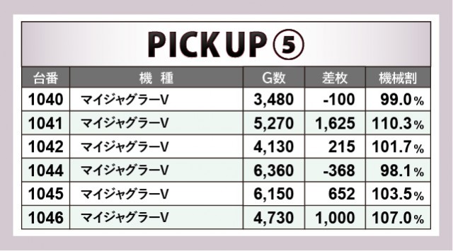 最後に『マイジャグラーV』について、やはり6台並びの好況スポットが存在していた。マイナス差枚を記録する台こそあれど、いずれもポテンシャルを感じられる内容だったのは間違いない。より回転数を重ねることでプラスへと転じた可能性があるうえ、コンスタントなGOGOランプの輝きが店内を明るく照らしてくれたことだろう。