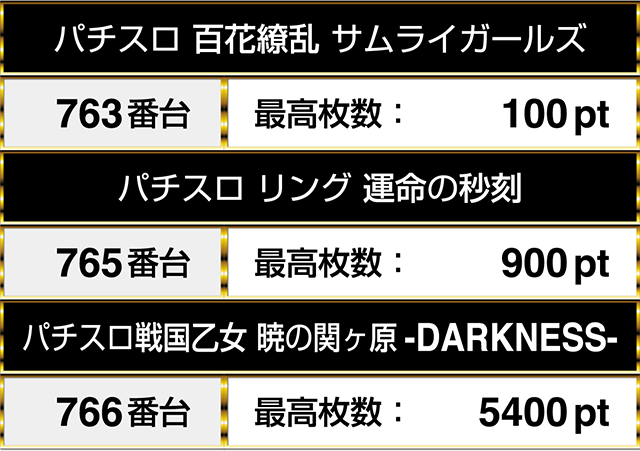 バラエティコーナーでは、763番台の『パチスロ 百花繚乱 サムライガールズ』から766番台の『パチスロ戦国乙女 暁の関ヶ原-DARKNESS-』までが連なってプラスpt!!