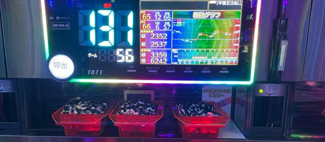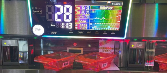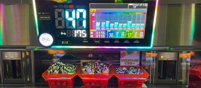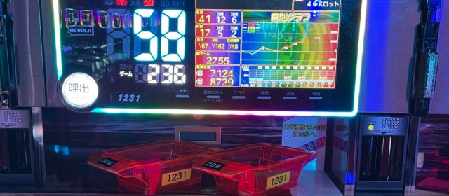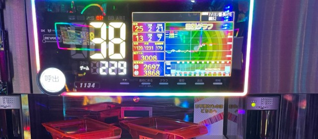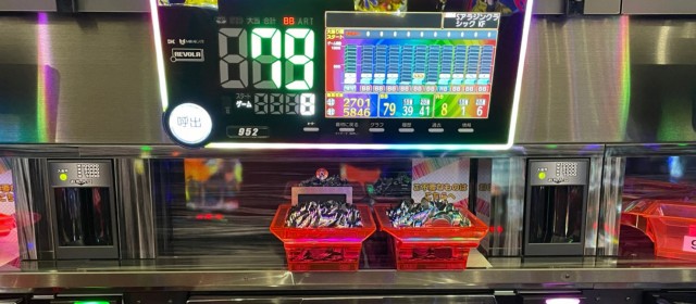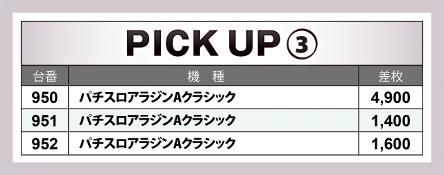 さらにこの日は5機種16台の横並び好況スポットが出現。それぞれの機種トータルでプラスを叩き出す中、特に目立ったのが+5千枚近くの台を筆頭に3台で+8千枚弱となった『パチスロ アラジンAクラシック』! 後ろ積みのドル箱も輝かしく光っていた。