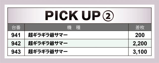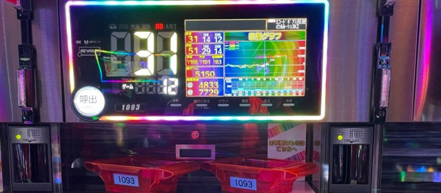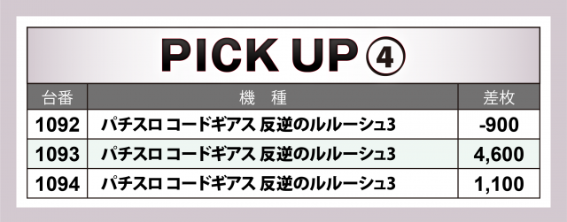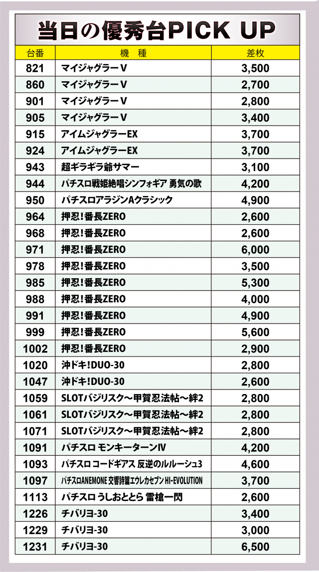 では[21.739] スロの結果を順次振り返っていく。この日の優秀30台は全台が差枚数+2千枚以上、うち20台が+3千枚以上と高水準。この日の圧巻は上表の通り『押忍!番長ZERO』9台。+6千枚超が1台&+5千枚突破が2台で、そのトータルは+3万7千枚オーバー! また3台で+1万3千枚弱となった『チバリヨ-30』も絶好調。さらに後述する横並び好況スポット以外にも+4千枚クラスが頻発、ドル箱使用台も散見されていた。