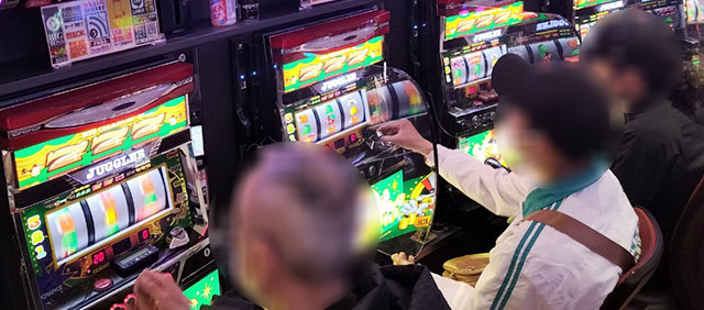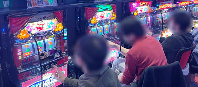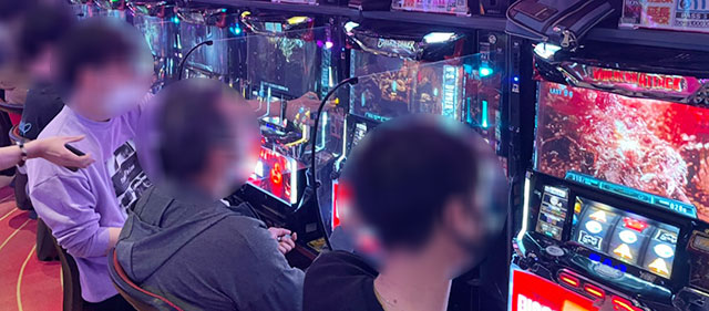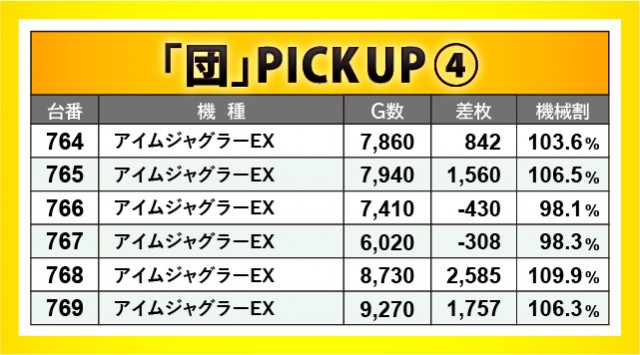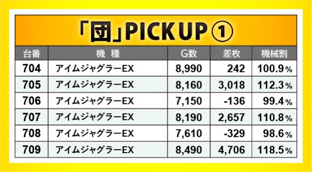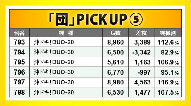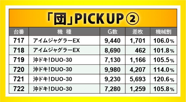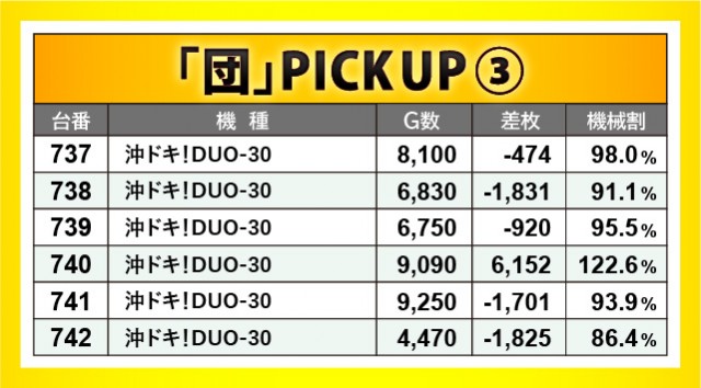 『アイムジャグラーEX』全49台・『沖ドキ!DUO-30』全45台では、複数ヶ所で6台横並びの盛り上がりスポットが見られた。残念ながらマイナス差枚を記録している台こそあれど、それぞれ回転数を鑑みれば、どれも手ごたえを感じられたと窺える。安定感抜群の『アイムジャグラーEX』では3千枚OVERが発生、さらに『沖ドキ!DUO-30』では6千枚OVERを達成するなど、「団」の力により各所で大きく盛り上がっていた。