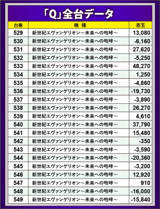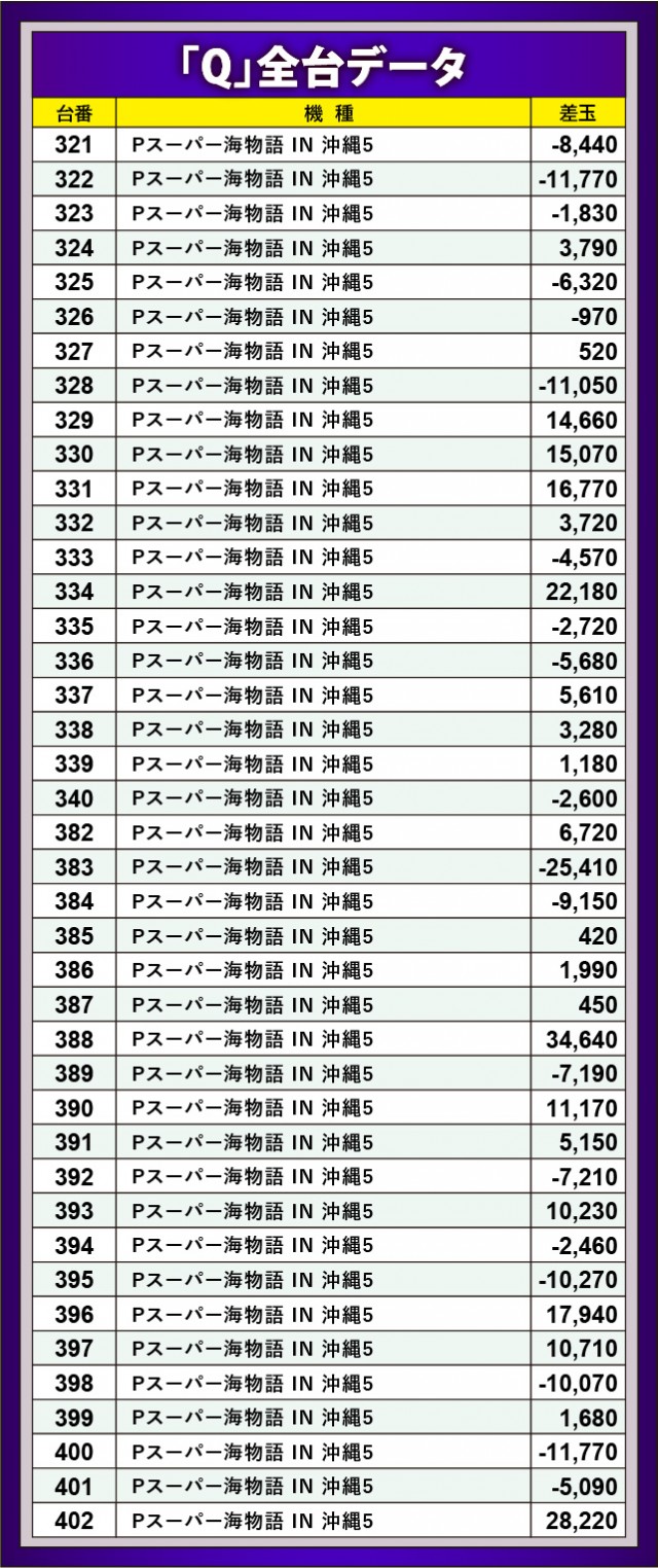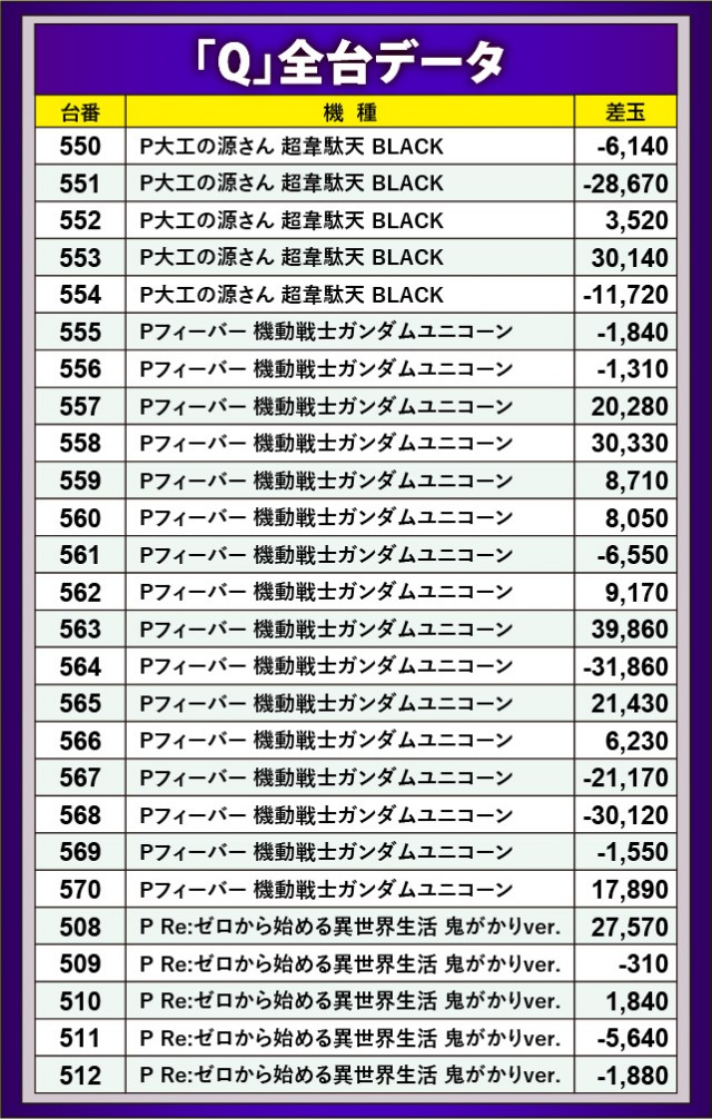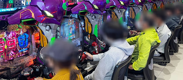 「Q」が降臨したパチンココーナーでは、『Pスーパー海物語 IN 沖縄5』『P Re:ゼロから始める異世界生活 鬼がかりver.』『Pフィーバー 機動戦士ガンダムユニコーン』『P大工の源さん 超韋駄天 BLACK』『新世紀エヴァンゲリオン〜未来への咆哮〜』の計5機種が活気を見せていた。すべての機種から万発OVERが当然のように発生し、さらには2~4万発OVERが飛び出すなど、凄まじい熱気を放っていたのが印象的だ。コンスタントな大当りだけでなく、連チャンにも恵まれていた展開は、遊技するファンにとって有意義な時間だったに違いない。