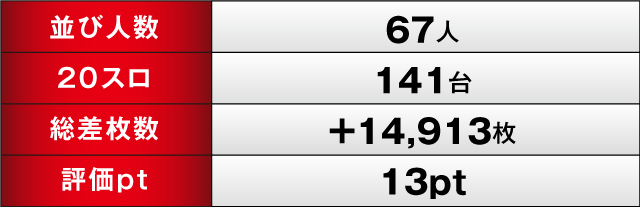 大盛り上がりとなった1日の結果は、総差枚数プラス14,913枚と大満足の結果になった。ただ、評価ptは13ptとなっており、まだまだ上を目指せる数値であった。同ホールの実力からすればまだまだ高い数値は出せるハズ! ぜひ次の機会では、今回以上の成績を目指していただきたい。