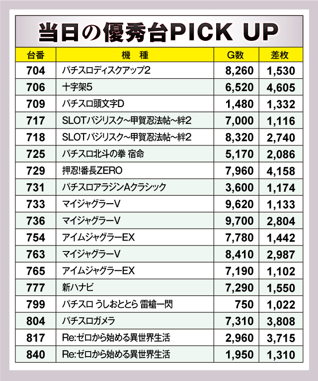 当日のホール内は、人気機種や最新機種など様々なコーナーから優秀台が出現。特に、新機種の『十字架5』や定番の『押忍!番長ZERO』は4千枚オーバー! 『パチスロガメラ』や『Re:ゼロ』からは3千枚オーバーと、素晴らしい成績を残していた。また、『バジリスク絆2』や『マイジャグラーV』はコーナー全体で盛り上がりを見せていた。