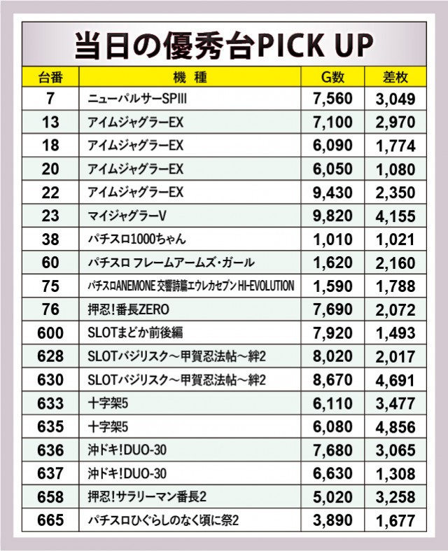 上表を見れば、多種多様な機種が名を連ねていることが分かるだろう。その中で突出した存在だったのが、『マイジャグラーV』『SLOTバジリスク~甲賀忍法帖~絆2』『十字架5』の3機種。いずれも4千枚OVERという記録を残し、さらには5千枚近くに迫る勢いを披露していた!他の機種も負けじと熱気を放ち、パチスロコーナーの盛り上がりを窺える内容になっている。