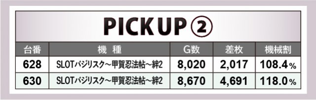 『アイムジャグラーEX』はノーマル機エリアの盛り上がりをけん引する存在となり、安定したパフォーマンスを披露していたと言える。一方で『SLOTバジリスク~甲賀忍法帖~絆2』は両台とも熱気を放ち、ファンに手ごたえを感じさせる展開を見せていた。どちらも相当な回転数が稼がれており、好挙動にレバーを叩く力が強くなっていったと想像できるはずだ。
