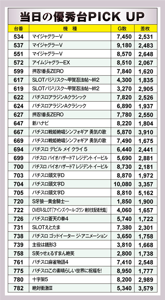 優秀台をチェックすると、『パチスロ頭文字D』がエンジン全開の大活躍!+5,162枚を記録した705番台、+3,357枚の704番台、+1,972枚の703番台と優秀台がズラリ。特に704番台はG数が10,080Gと、稼働も素晴らしかった。これに続いたのが+3,910枚の『パチスロ戦姫絶唱シンフォギア 勇気の歌』667番台。以下、+3,579枚の『絶対衝激Ⅲ』782番台、+2,989枚の『十字架5』780番台、+2,905枚の『SLOTバジリスク〜甲賀忍法帖〜絆2』619番台と続く。