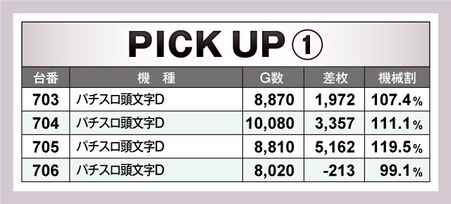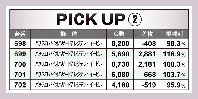 ピックアップ機種では、優秀台でも紹介した『パチスロ頭文字D』、『パチスロ バイオハザード7レジデント イービル』が並びで活躍台を送り出していた。