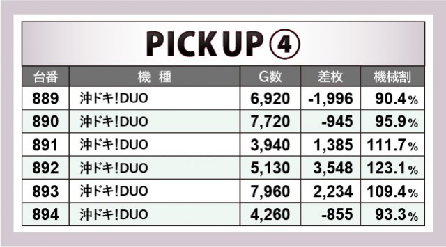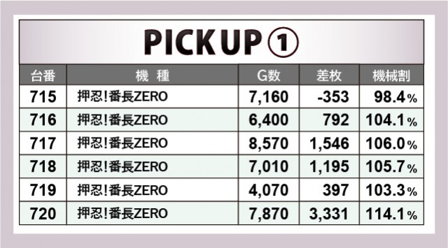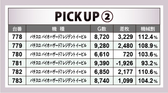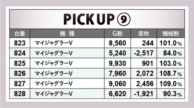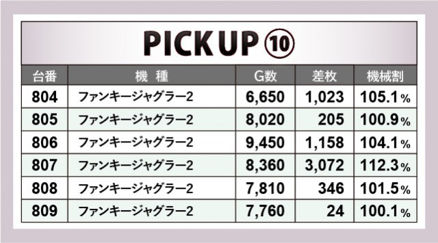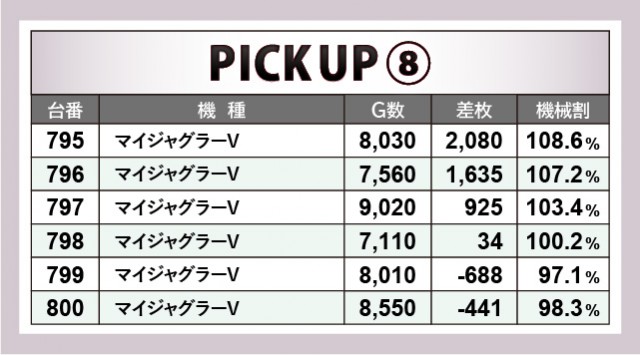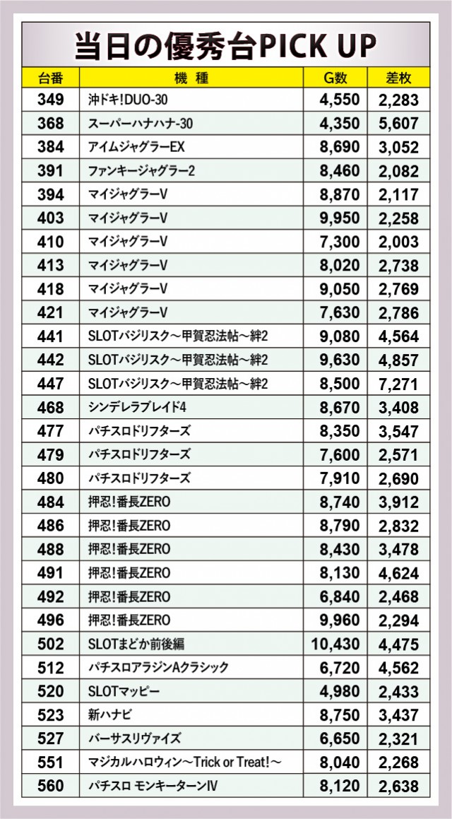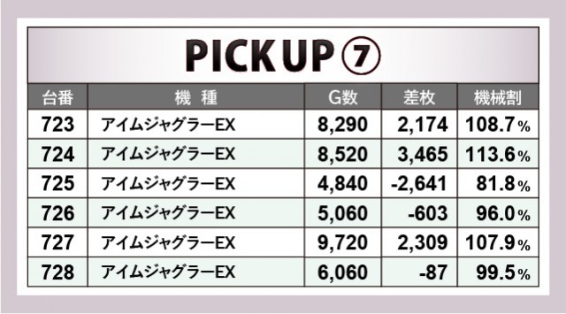 安定感抜群の数字を残しているのが印象的なのは、『ジャグラー』シリーズの3機種だ。やはり『マイジャグラーV』の存在感が抜群で、795番台~800番台の横並びは確かな手ごたえを感じられたエリアだったに違いない。また『アイムジャグラーEX』では723番台・724番台・727番台の3台から2~3千枚OVERが発生。『ファンキージャグラー2』に至ってはプラス差枚を記録した6台がズラリと並び、鮮烈な光景を作っていたのが好感を覚えるポイントだ。