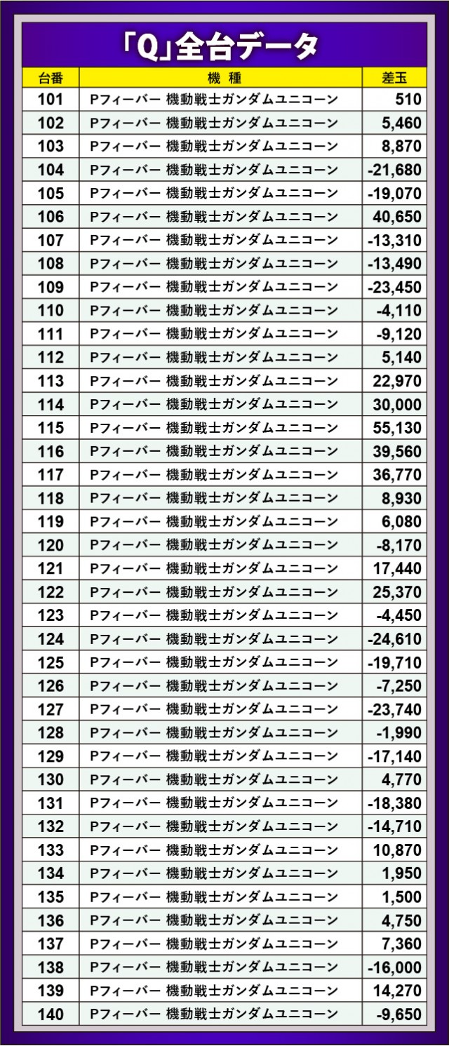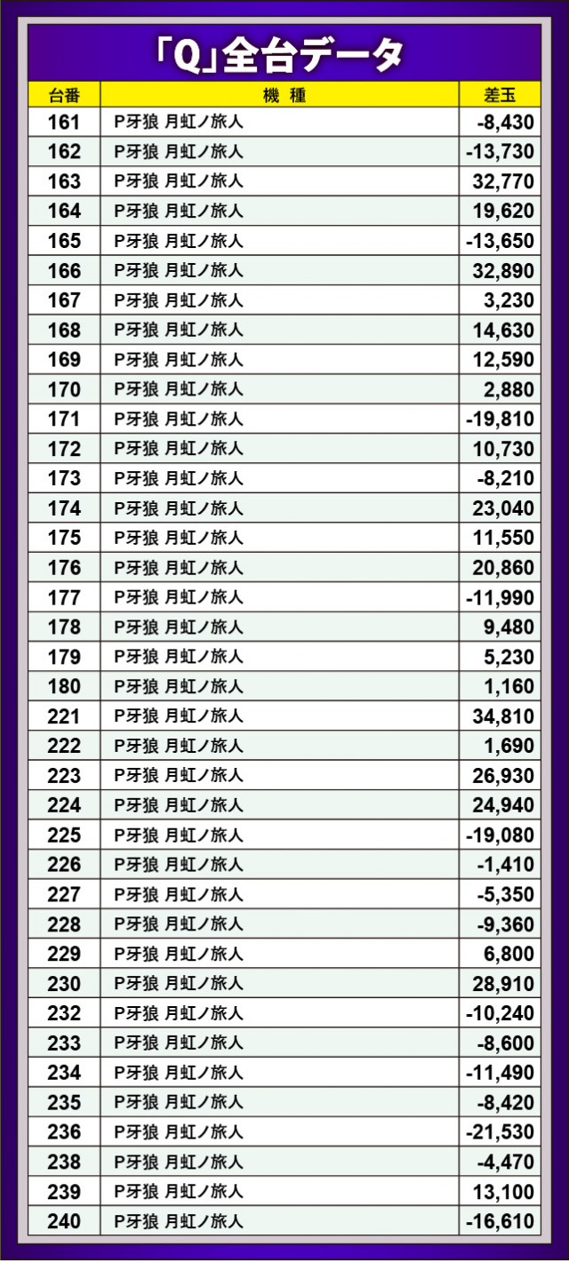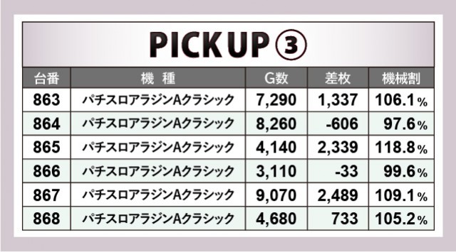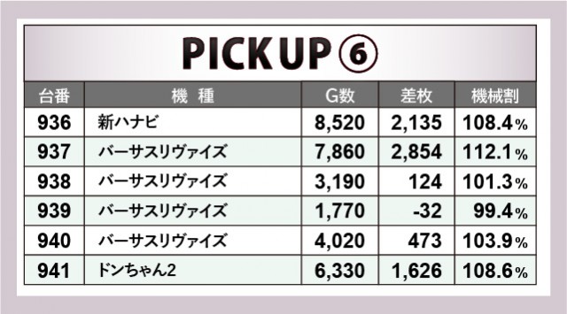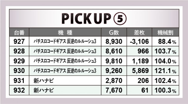 AT機群の詳細を見ていくと、いずれも6台横並びの塊たちが目立っていた。惜しくもプラスに届かなかった台こそあるが、それぞれのゲーム数に着目すれば、多大なチャンスがあったと分かるだろう。その中でも『パチスロコードギアス 反逆のルルーシュ3』930番台+5,869枚・9,260Gという数字が突出しており、これに匹敵する記録を残した機種も多く見られたのは上表の通りだ。