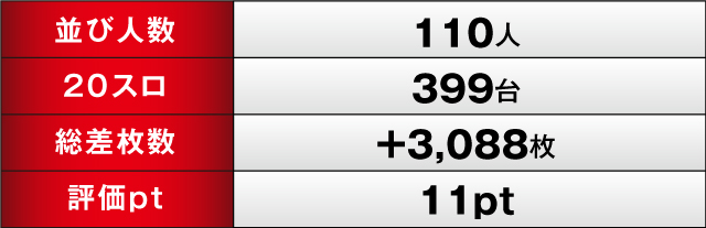 パチスロ全体では、トータルで+3,088枚の差枚を記録。デビューから続く連勝をさらに伸ばした。また、前回よりはダウンしてしまったが、評価ptも11ptを獲得。ファンの期待に応えたのであった。
