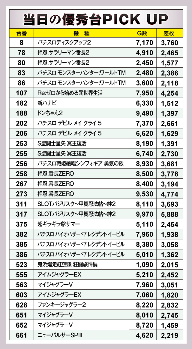 優秀台を見てみると、+5,888枚を記録した『SLOTバジリスク〜甲賀忍法帖〜絆2』の317番台を筆頭に、+3,693枚の同311番台、+4,774枚の『押忍!番長ZERO』273番台、+3,778枚の同258番台、+3,194枚の同267番台、+4,254枚の『Re:ゼロから始める異世界生活』107番台、+3,760枚の『パチスロディスクアップ2』8番台、+3,681枚の『パチスロ戦姫絶唱シンフォギア 勇気の歌』256番台、+3,058枚の『パチスロ バイオハザード7レジデント イービル』385番台、+3,051枚の『マイジャグラーⅤ』563番台が+3,000枚オーバーの活躍を見せていた。