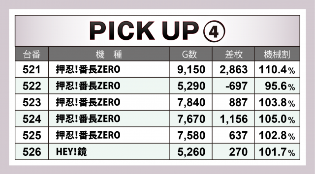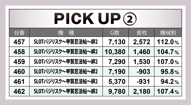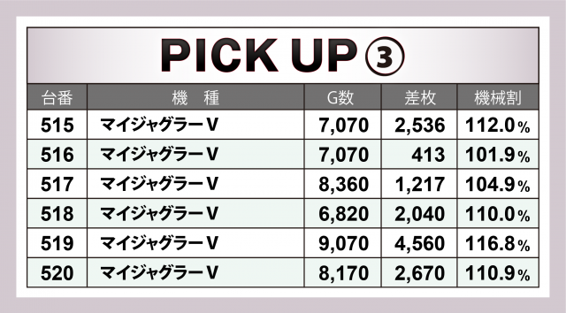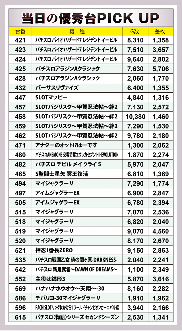 まずは優秀30台のPICK UPから。30台のうち約3分の2が差枚数+2千枚以上となり、後述する横並び好況スポット以外でもドル箱を複数使用している台が数々目に付いた。