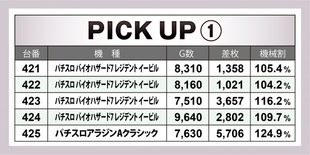 続いては当日出現した横並び好況スポット4か所をチェック。特に優秀だったのが『パチスロ バイオハザード7 レジデント イービル』&『パチスロアラジンAクラシック』の計5台。トータルで+1万5千枚弱&1台平均で+3千枚に迫るハイスコアに。この他『マイジャグラーⅤ』は+5千枚弱の台を筆頭に6台全てがプラス&合計で+1万3千枚オーバー!