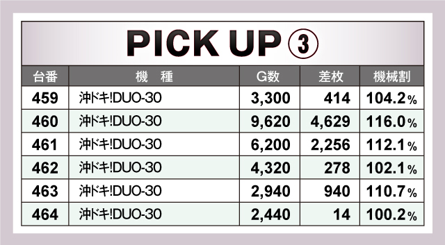 『押忍!番長ZERO』の420番台では差枚4,414枚、452番台では差枚7,806枚と好記録を達成。『沖ドキ!DUO』でも460番台が4,629枚と、ホールのみなぎる気合いが手に取るように感じ取られた。