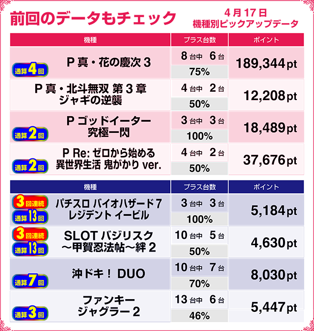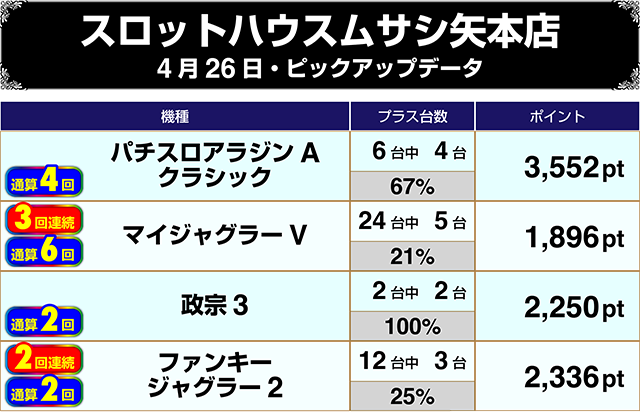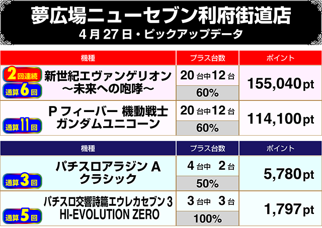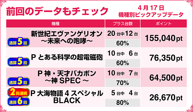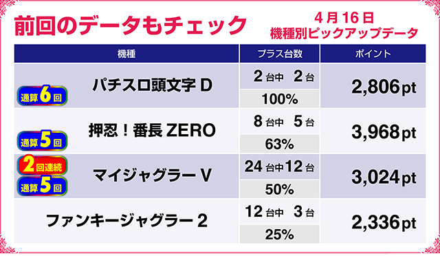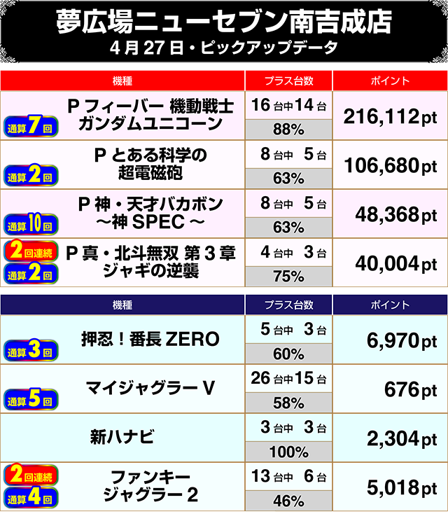 パチスロでは、ピックアップがなかった1店舗を除いて、それぞれの店舗に全台がプラスを記録した機種があった。