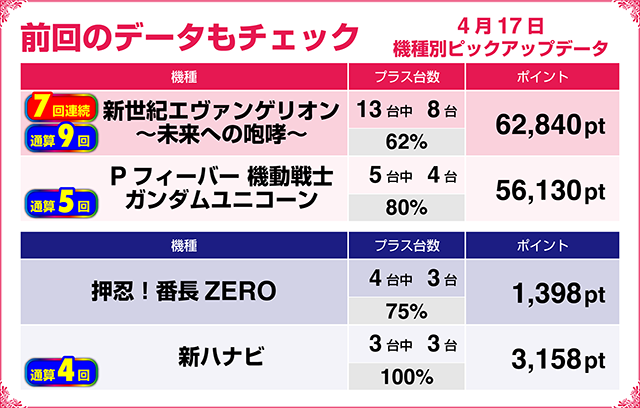 17日や27日など、好調なデータが固まりやすい傾向にある7日が、ゴールデンウィークかつ週末に重なる次回の10日間は、みごたえのあるピックアップ機種が姿をあらわしそうだ。