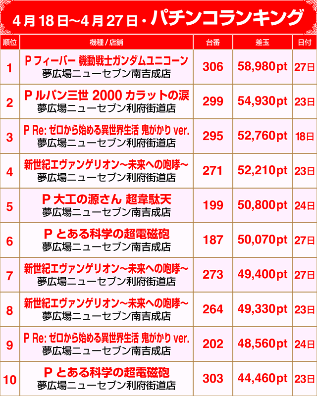 通算で9回登場している『Pフィーバー 機動戦士ガンダムユニコーン』や7回連続でピックアップされている『新世紀エヴァンゲリオン~未来への咆哮~』など、注目すべき機種は多数!