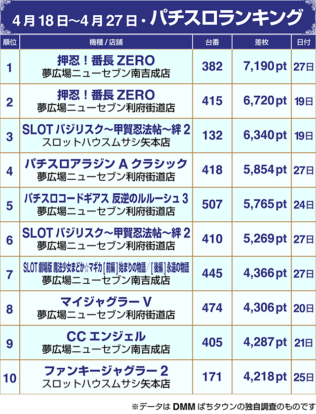 8機種が名を連ね、パチンコと同様に狙い目が満載のランキングとなった。