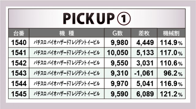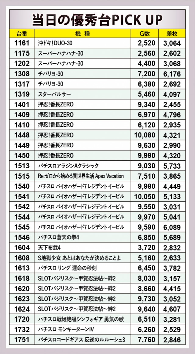 優秀台に名を連ねている人気機種の名前に目を奪われる一方で、沖スロやバラエティー機種など、幅広いラインナップがピックアップされた。いずれも2千枚OVERを達成する台であり、『チバリヨ-30』1308番台+6,176枚や『パチスロ バイオハザード7 レジデント イービル』1545番台+6,089枚といった突出した記録も飛び出している。あらゆる機種にチャンスがあった様子が窺え、同店のポテンシャルや実力を感じずにはいられない。