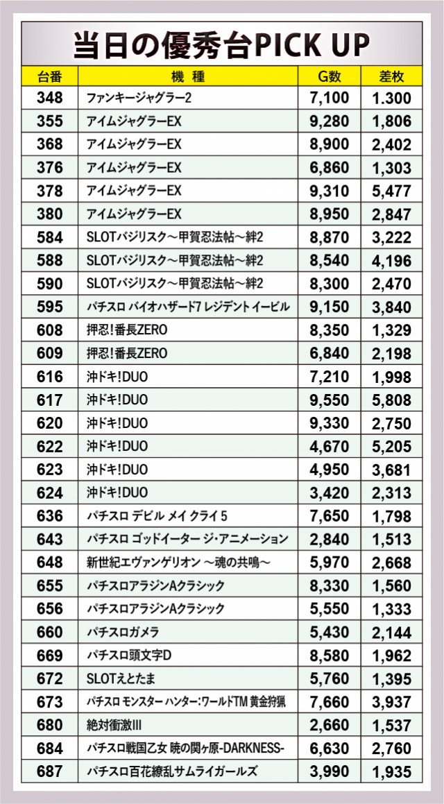 王道機種『アイムジャグラーEX』から5千枚OVERが飛び出しており、さらに定番の『SLOTバジリスク~甲賀忍法帖~絆2』『押忍!番長ZERO』といった機種が名を連ね、しっかりと総差枚数プラスを記録した今回。他にも『パチスロ バイオハザード7 レジデント イービル』595番台+3,840枚・『パチスロ モンスター ハンター:ワールドTM 黄金狩猟』673番台+3,937枚といった記録も飛び出しており、各所で熱気が噴出していたのが印象的だ。