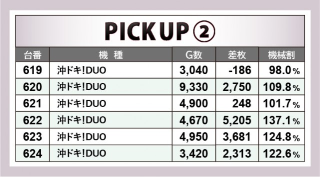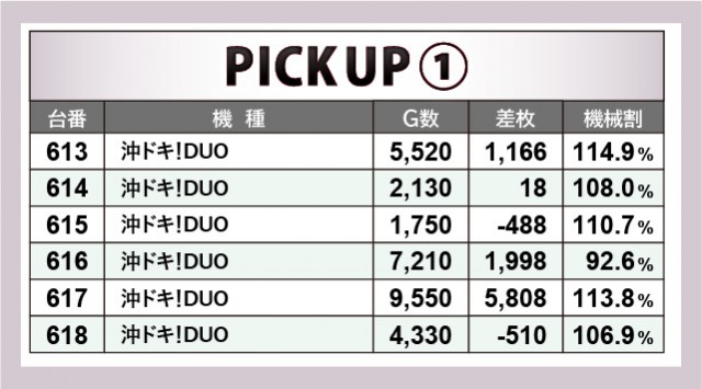 全12台が設置されている『沖ドキ!DUO』は全台プラス差枚とはならなかったものの、全体的に好況だったと窺える数字を残している。617番台+5,808枚・622番台+5,205枚といったように、5千枚OVERという大台を記録しつつ、2~3千枚OVERも飛び出していたのが鮮烈だった。マイナス差枚も大きくなく、やはり全台が凄まじいポテンシャルを秘めていたと言えるだろう。