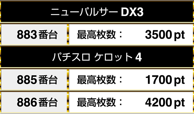 『ニューパルサーDX3』の1台は『パチスロ ケロット4』の2台と並んでプラスptとなり、どちらにも3000pt以上の台があった。