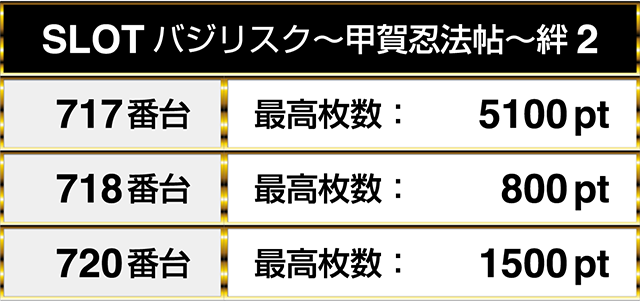 5100ptの台があった『SLOTバジリスク~甲賀忍法帖~絆2』も3台が並んでプラスpt!!
