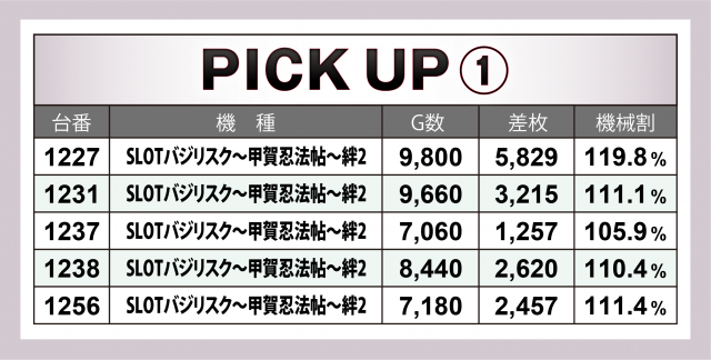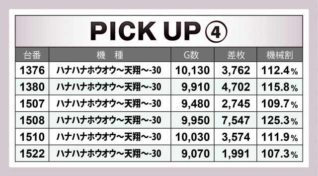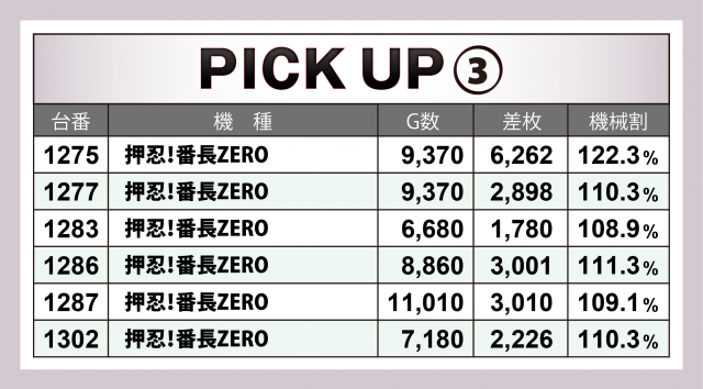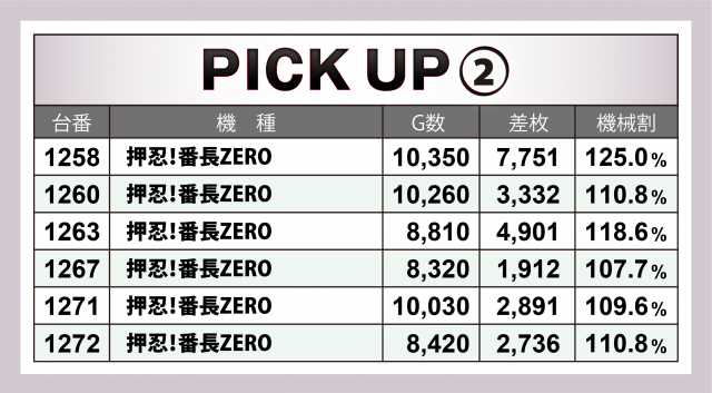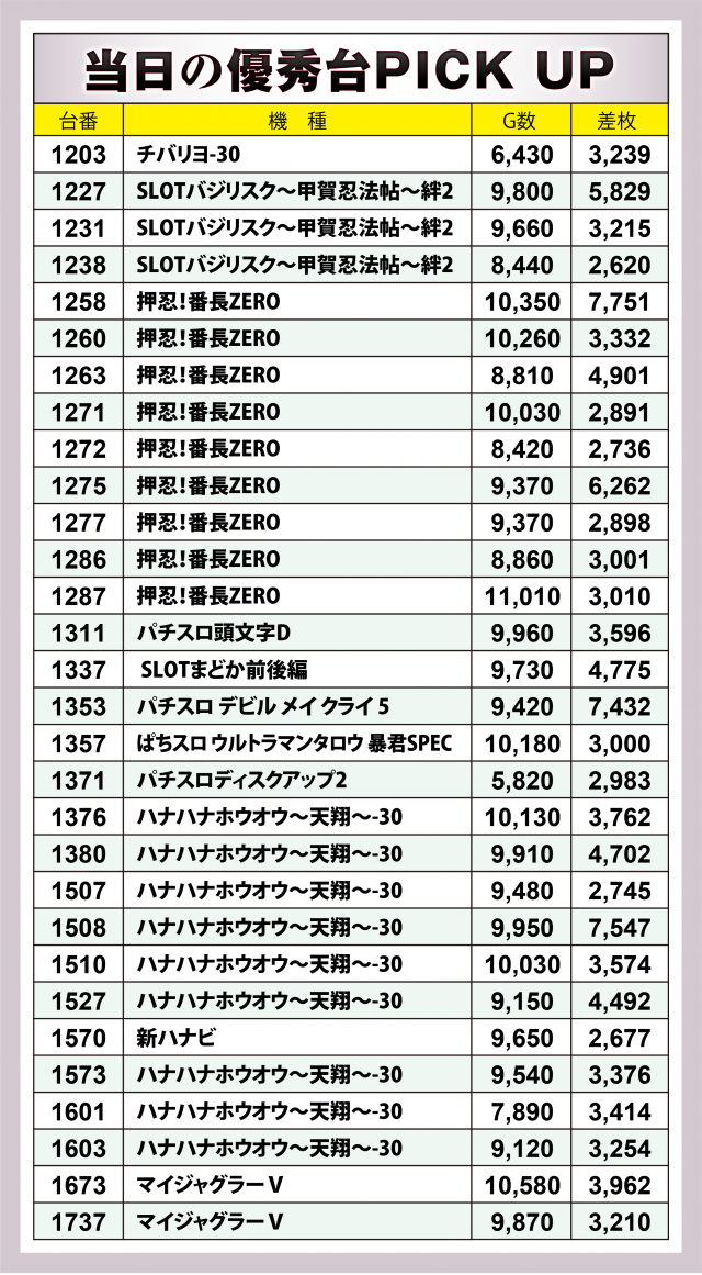 続いてはこの日の好調4機種に注目。中でもハイスコアを残したのが『押忍!番長ZERO』『ハナハナホウオウ~天翔~-30』の2機種で、共に+7千枚突破台を筆頭に12台合計で+4万2千枚という差玉をホームラン! その他『SLOTバジリスク~甲賀忍法帖~絆2』は+6千枚弱の台をトップに5台トータルで+1万5千枚をマーク!!
