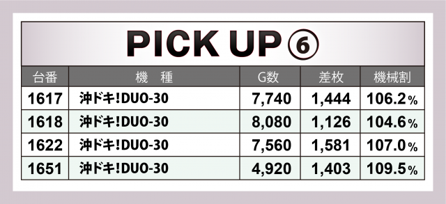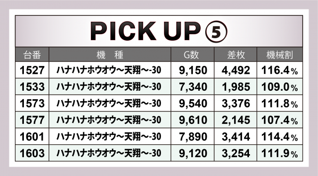 まずは優秀30台のPICK UPから。なんとこの全てが差枚数+2千枚以上、うち23台が+3千枚以上、さらに5台が+5千枚オーバー! 後述する好調4機種以外では+7千枚を突破した『パチスロ デビル メイ クライ 5』や+5千枚に迫る勢いとなった『SLOT劇場版 魔法少女まどか☆マギカ[前編]始まりの物語/[後編]永遠の物語』の成績が光った。またこれ以外にも店内には誇らしい枚数表示が数多く踊っていた。
