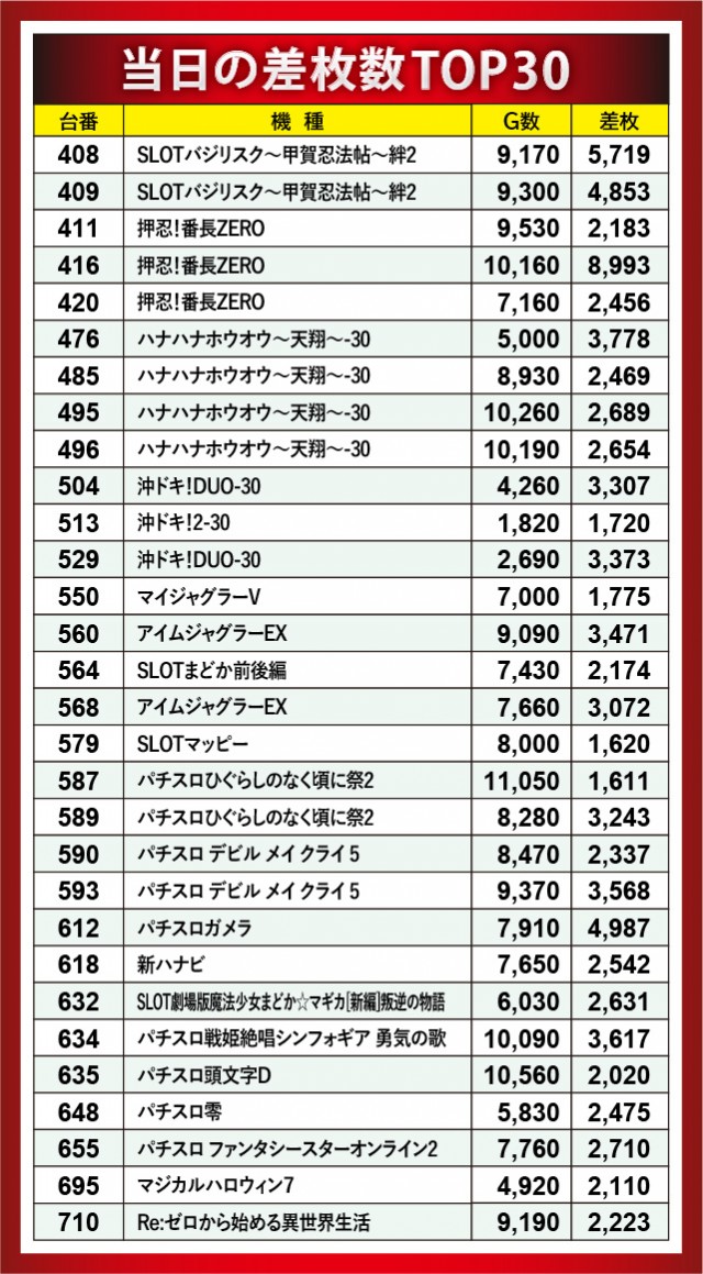 上表をご覧の通り、万回転を突破した台が多く見られたのが特徴的だった。それに伴い、『SLOTバジリスク~甲賀忍法帖~絆2』では+5,719枚、『パチスロガメラ』+4,987枚といった大台到達台も見られる。当日の最高記録は『押忍!番長ZERO』416番台+8,993枚となっており、こちらでも万回転到達を確認できることから、相応に手ごたえを感じられたのは間違いない。