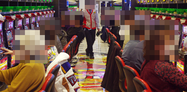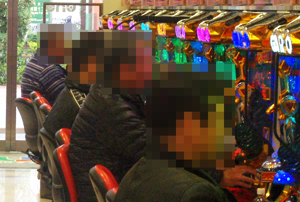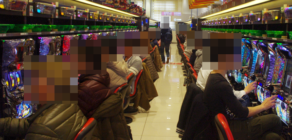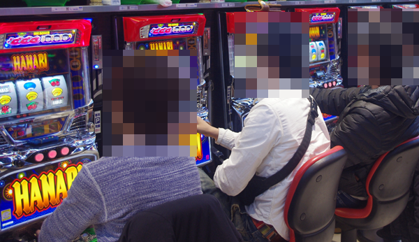 「バジリスク〜甲賀忍法帖〜絆」、ジャグラーシリーズや「ハナビ」も華やかな状況となっており、楽しそうな笑顔をみせるプレイヤーが多数。