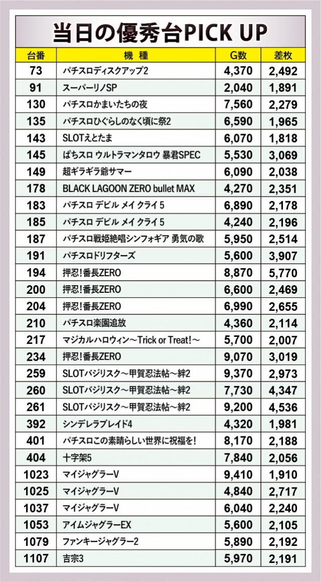 多種多様な機種が名を連ねており、それでいて大台を突破する台も見受けられる。館内各所で遊技するファンたちは、各々が自信を持ってレバーを叩けたのだと伝わってくるだろう。『ぱちスロ ウルトラマンタロウ 暴君SPEC』『パチスロドリフターズ』から3千枚OVERが発生し、その他の機種からも熱気が噴出していたのも、上表を見れば明らかだ。