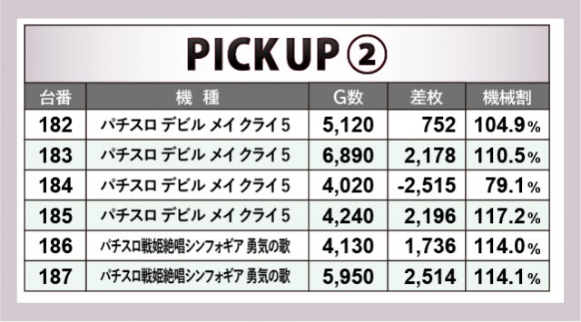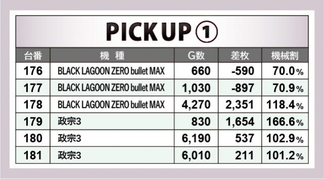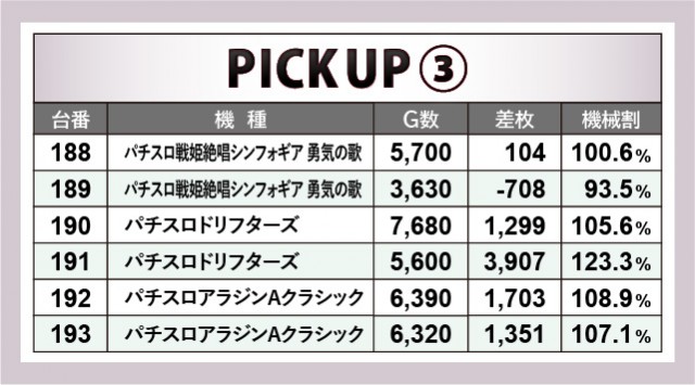 ピックアップされた優秀台から見えてくるように、横並びスポットが連続で並び立っていたのが特徴的である。176番台~181番台・182番台~187番台・188番台~193番台・194番台~199番台において数千枚OVERが連続する台が見られ、さらにはゲーム数もしっかりと稼がれている様子から、やはり好印象を受けるエリアだった。