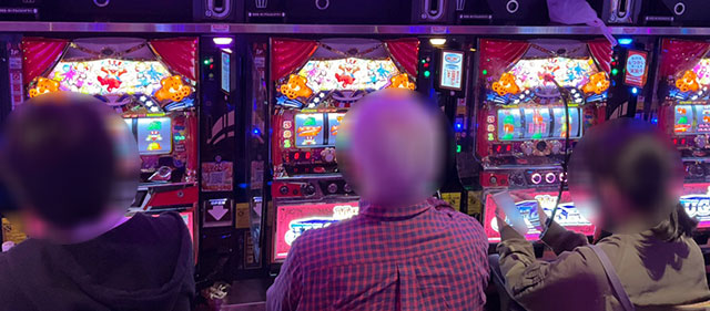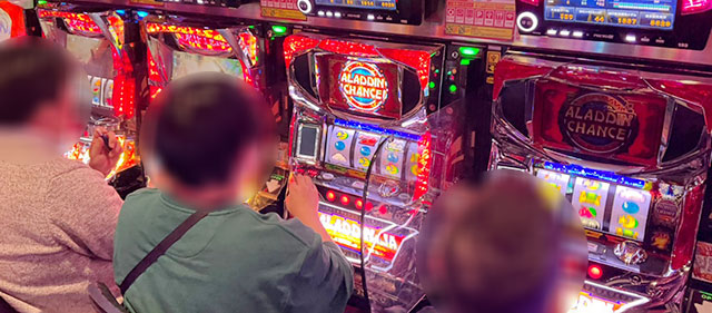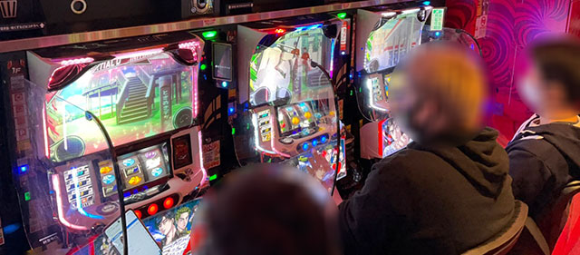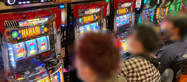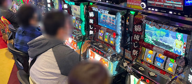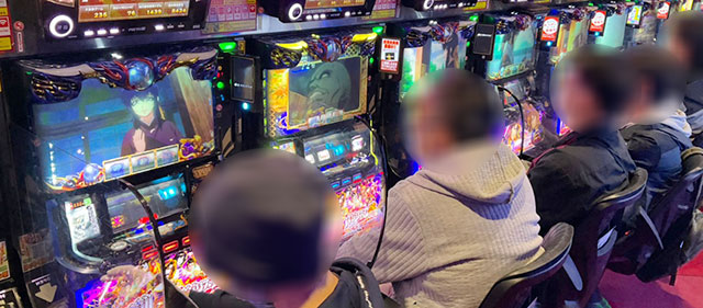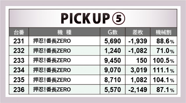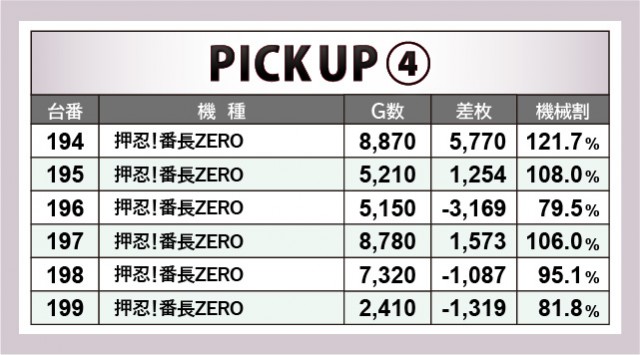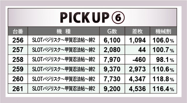 人気機種である『押忍!番長ZERO』『SLOTバジリスク~甲賀忍法帖~絆2』においても、やはり6台の横並びスポットが見られた。目覚ましい活躍を披露したのは後者で、260番台+4,347枚・261番台+4,536枚という記録は、実際に目の当たりにしても圧巻だろう。