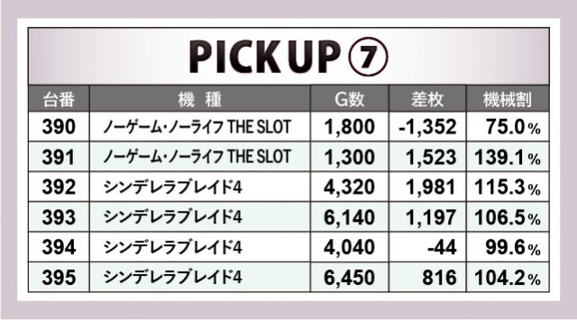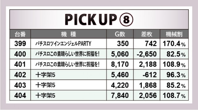 メイン機種に負けない活躍を見せたのは、上表にある機種群だ。『シンデレラブレイド4』『十字架5』ではじっくりと遊技をされた痕跡が見られ、ファンも手ごたえを感じられたことだろう。『パチスロこの素晴らしい世界に祝福を!』は両極端な結果となっているが、やはりレバーに力が入りやすい状況だったのは間違いない。