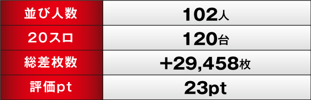 終わってみれば、パチスロのトータル差枚は+29,458枚のプラス。危なげない勝利で連勝をさらに伸ばした、評価ptも23ptを獲得。多くのファンが満足して家路についたことはいうまでもない。