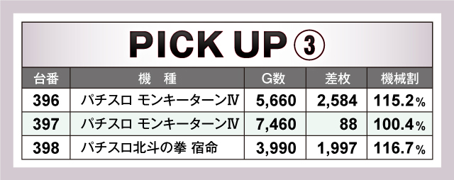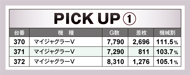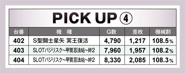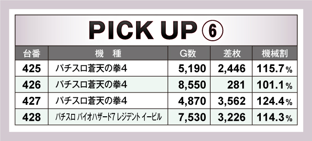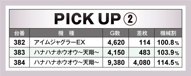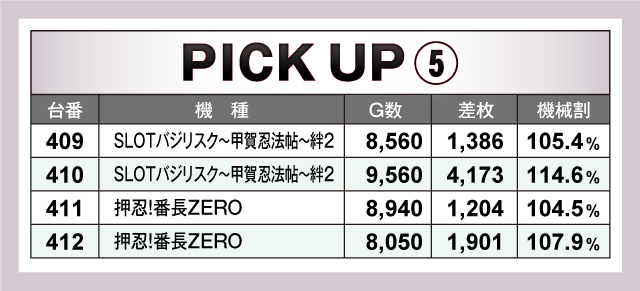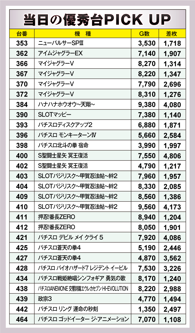 ピックアップ機種では、『マイジャグラーⅤ』、『ハナハナホウオウ〜天翔〜』、『パチスロ モンキーターンⅣ』、『SLOTバジリスク〜甲賀忍法帖〜絆2』、『押忍!番長ZERO』、『パチスロ蒼天の拳4』などが並びで好出玉をマークしていた。