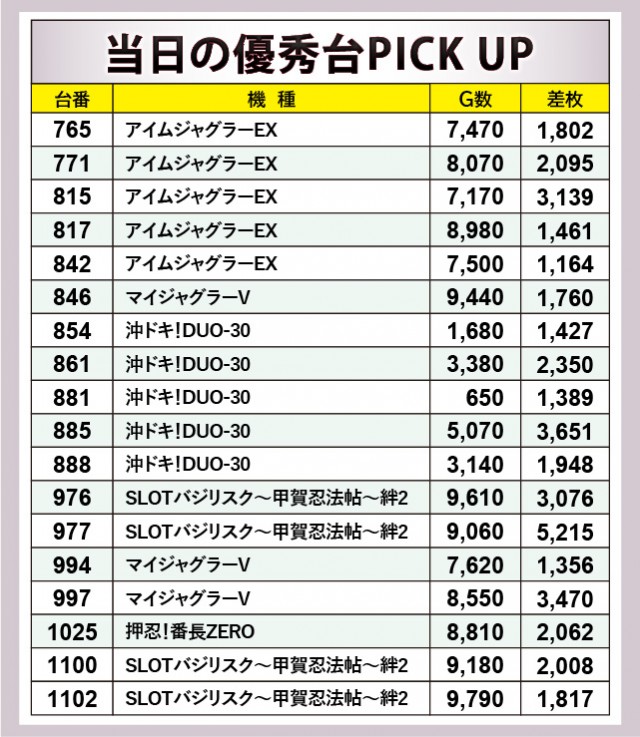 ピックアップされた優秀台を見れば分かるように、『アイムジャグラーEX』『SLOTバジリスク~甲賀忍法帖~絆2』『押忍!番長ZERO』といった人気機種群が目立っていた。特に『SLOTバジリスク~甲賀忍法帖~絆2』からは3千枚OVERと5千枚OVERが発生しており、横並びということもあって目立った存在だったはずだ。いずれも消化されたゲーム数が多く、しっかりと手ごたえを感じられる状況だったのは間違いない。