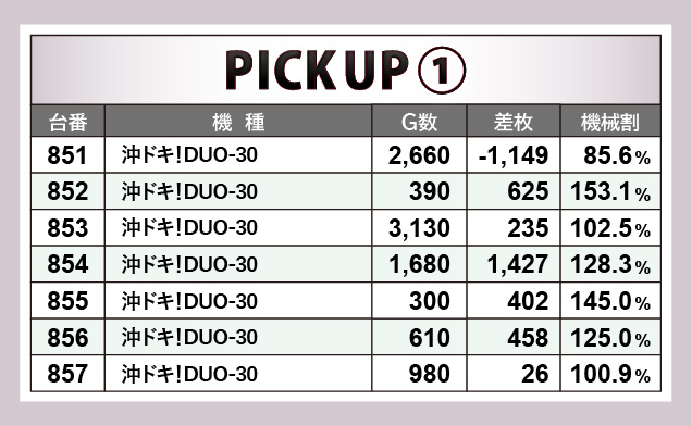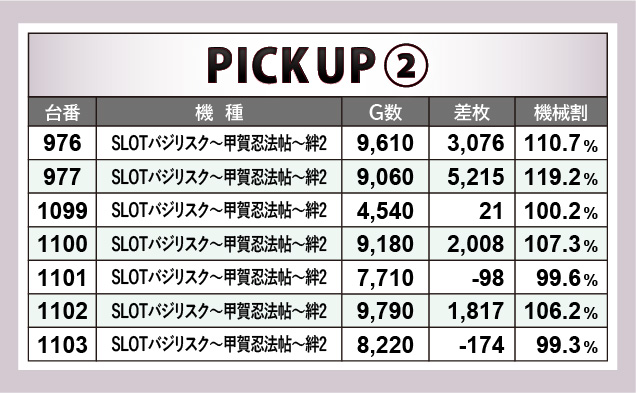 『沖ドキ!DUO-30』『SLOTバジリスク~甲賀忍法帖~絆2』をさらに深掘りしていくと、横並びスポットを確認できるだろう。他機種にも同様の傾向が見られ、概ね3台横並びの好況スポットが多々見られたのが印象的だった。『SLOTバジリスク~甲賀忍法帖~絆2』では回転数と差枚数が伴う結果が多く、僅かながらマイナスに甘んじた台こそあるが、上々の結果と言える。