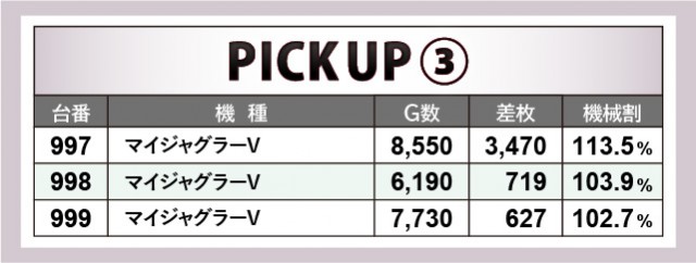 一方で『マイジャグラーV』の3台横並びスポットでは、全台プラス差枚となるエリアを確認。他の台でも同様の傾向があるのは前述の通りで、具体的には『アイムジャグラーEX』にて複数の好況スポットが存在していた。ド派手な結果こそ多くはないが、しっかりと結果を残した台・エリアがあり、ファンたちがしっかりと状況を見抜けていたかどうかがハッキリと見られた内容だ。