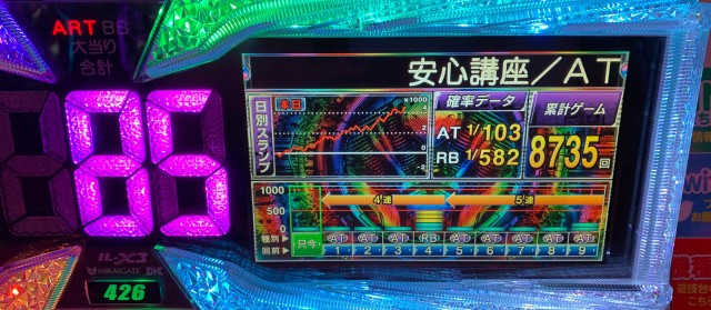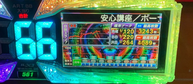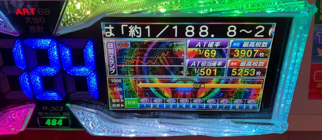 今回の[21.739] スロ計266台ではトータル差枚数は前回よりも大きなマイナスに終わり残念な結果に。とは言え、評価ptは前回の10よりも上回る15を記録したことは好材料。次回こそは念願のトータルプラスを成し遂げたい!