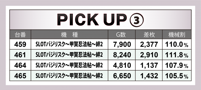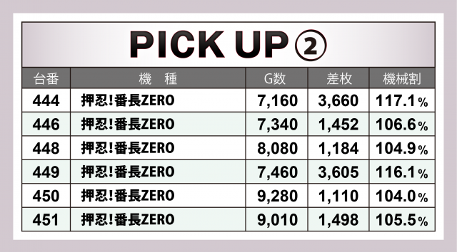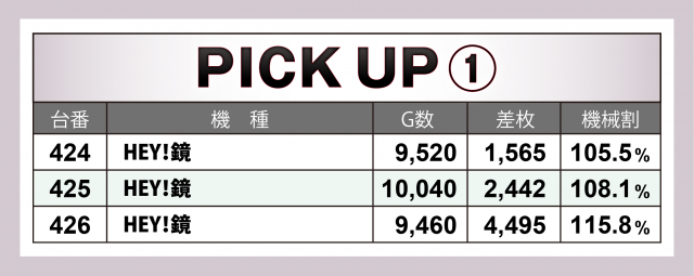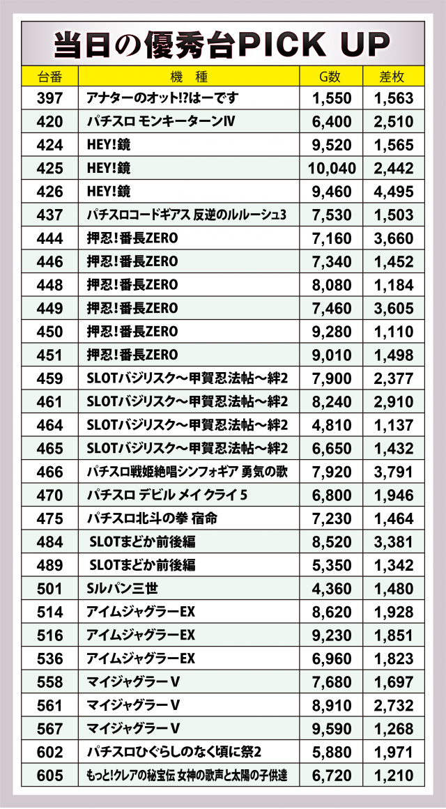 またこの日は4機種17台が好調。その多くが横並びでプラス差枚を記録し、中でも台数&差枚数どちらも多さが際立ったのが『押忍!番長ZERO』で、6台トータルで+1万2千枚を達成! それに次いだのが『HEY!鏡』で、+4千枚突破台を筆頭に設置3台全てがプラス&合計で+8千枚オーバーに。
