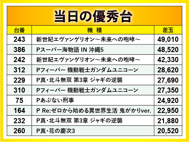 『新世紀エヴァンゲリオン〜未来への咆哮〜』では4万発OVER、『Pフィーバー 機動戦士ガンダムユニコーン』でも3万発近い差玉が発生しており、この二大巨頭が大きく活躍したのが印象的だ。