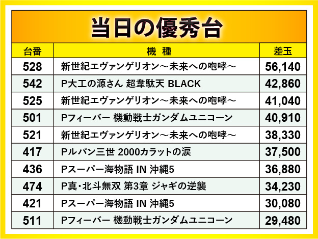 『Pフィーバー 機動戦士ガンダムユニコーン』『新世紀エヴァンゲリオン〜未来への咆哮〜』両台の総差玉数は驚きの30万発超えで、メイン機種としての務めをしっかりと果たしたと言える。