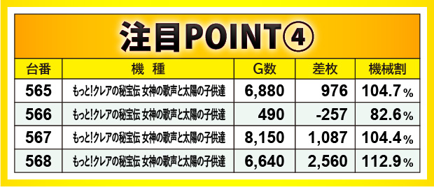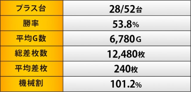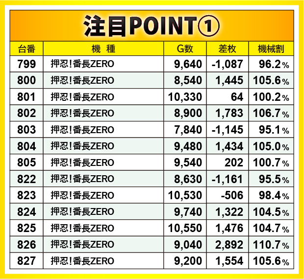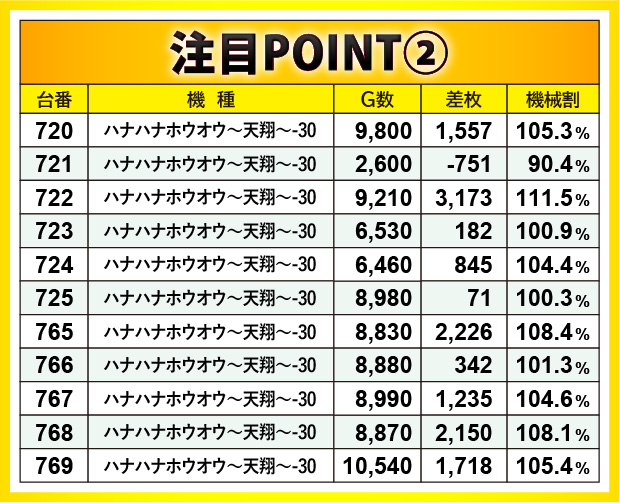 大きな特徴としては、横並びの好況スポットが形成されていた点で、消化ゲーム数からも手ごたえを感じられたエリアだと分かる。