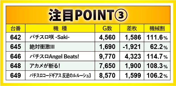 『パチスロ咲 -Saki-』『アカメが斬る!』『パチスロコードギアス 反逆のルルーシュ3』が熱気を放ち、『パチスロAngel Beats!』では+4,323枚が放出され、多くの目を惹きつける展開を披露していた。