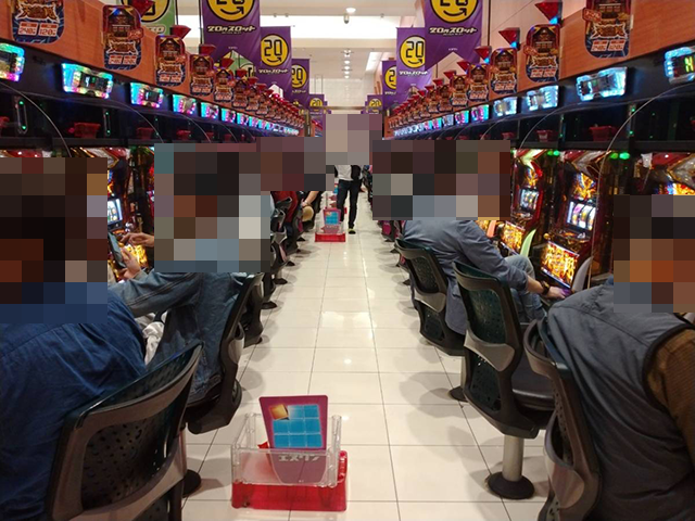 14時頃のパチスロコーナーでは、機種を問わずに楽しそうな光景が広がっていた。