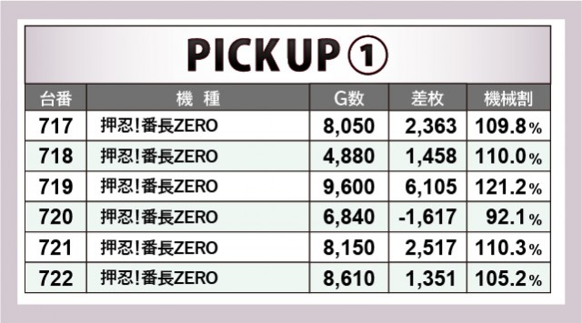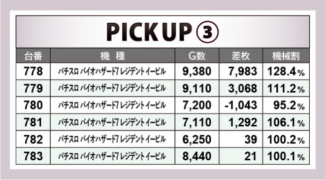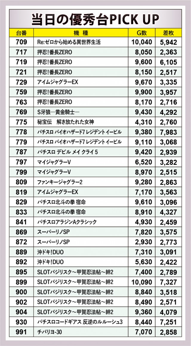 まずは当日の優秀台を取り上げていくが、5千枚OVERを達成する機種が多く見られるのが鮮烈だ。『Re:ゼロから始める異世界生活』『押忍!番長ZERO』『パチスロ バイオハザード7 レジデント イービル』『SLOTバジリスク~甲賀忍法帖~絆2』『パチスロコードギアス 反逆のルルーシュ3』という、いずれも人気の高い機種が活躍。他の機種も追随するように奮闘し、館内全体の大盛り上がりを後押ししていた。